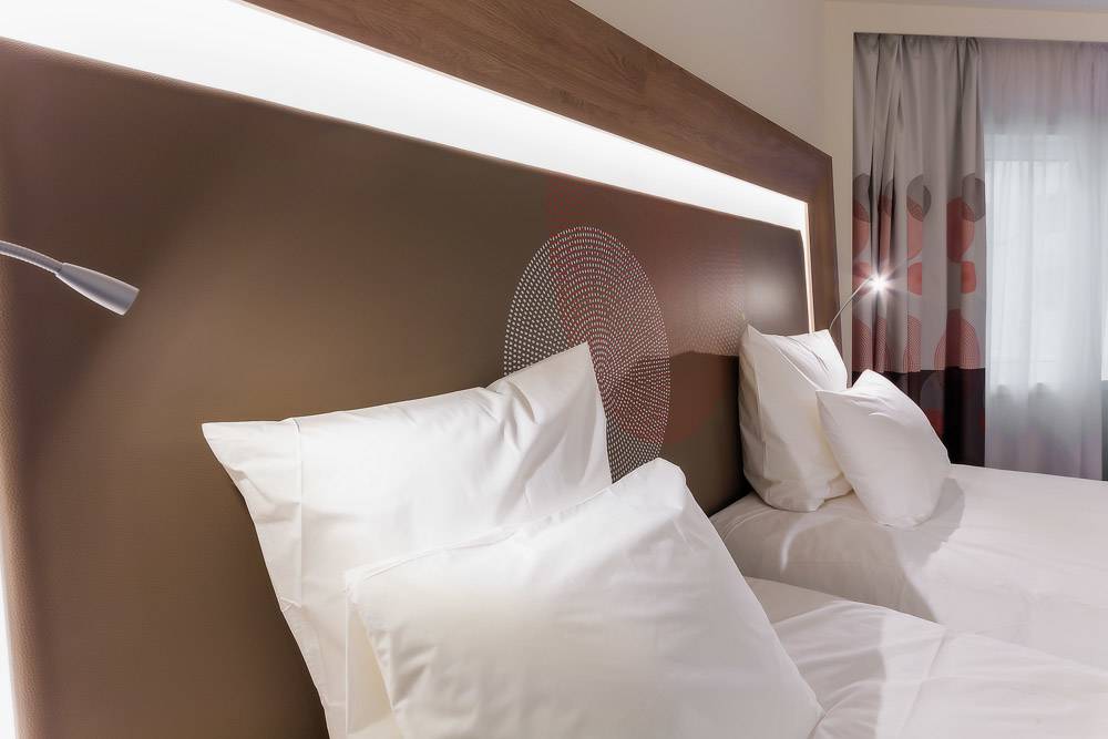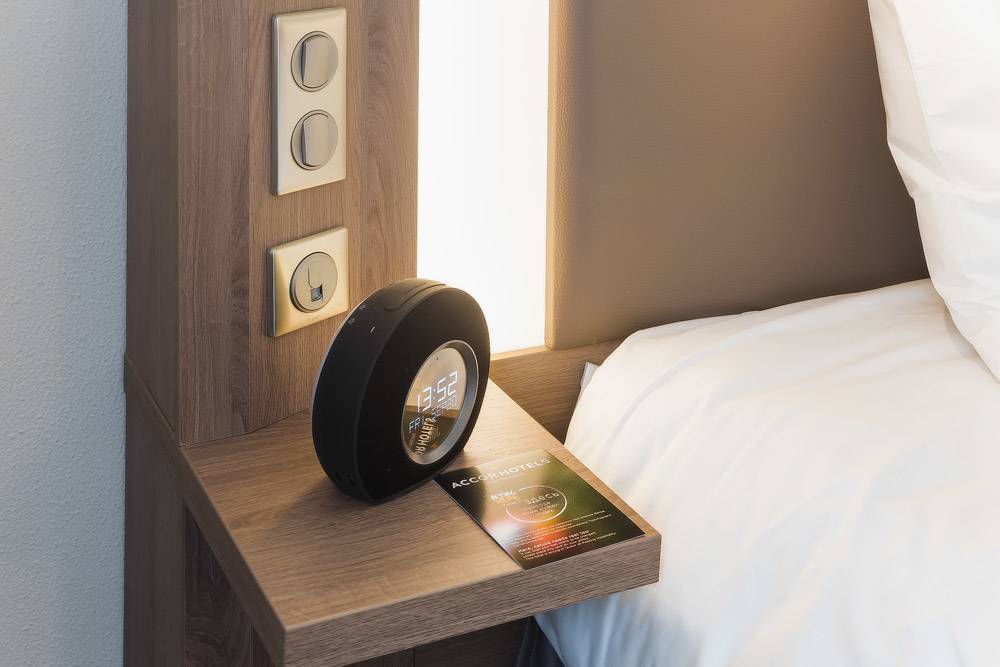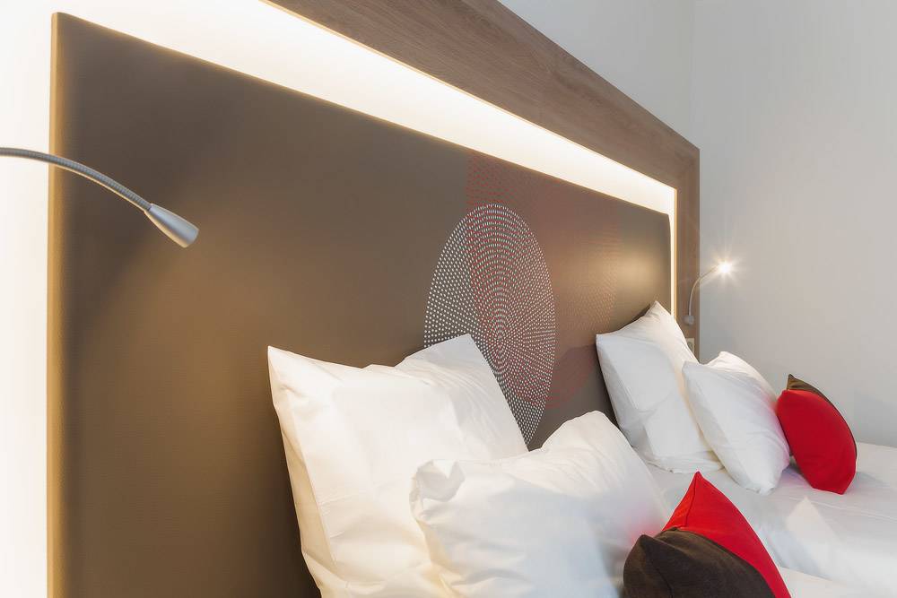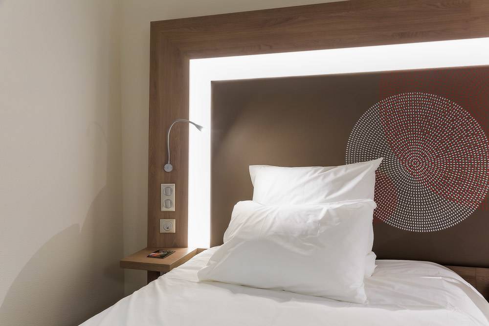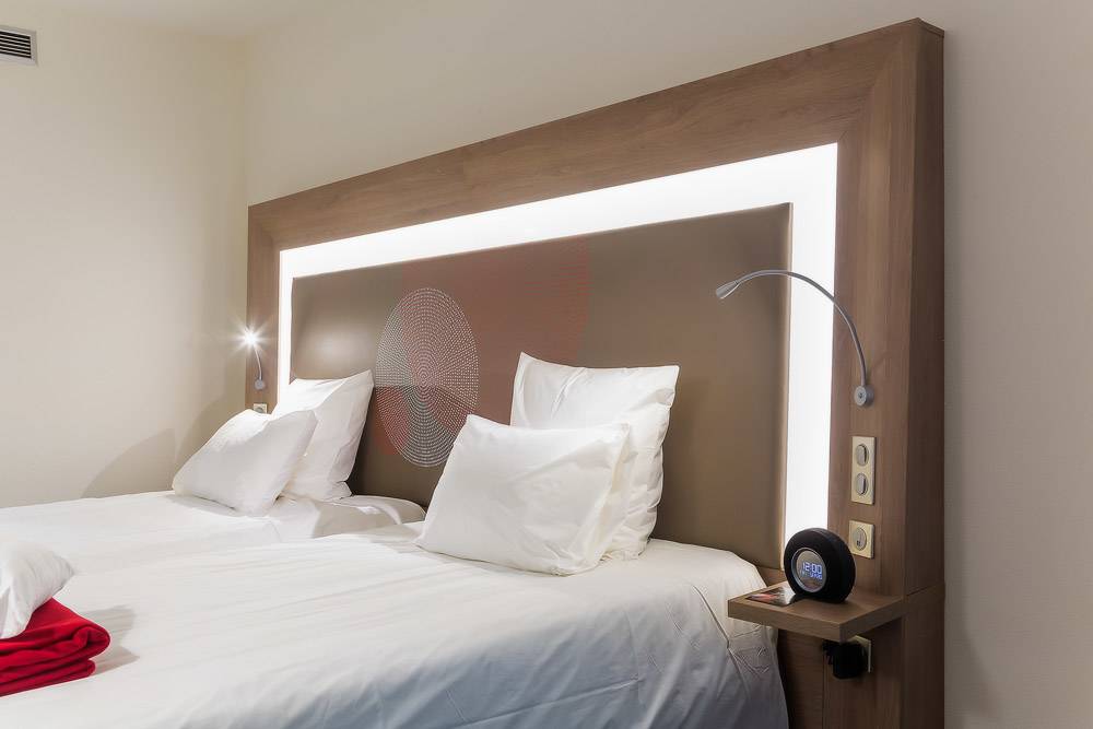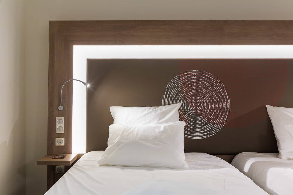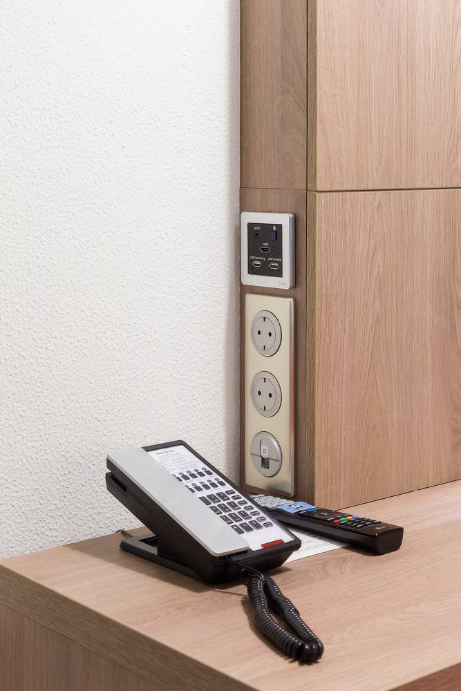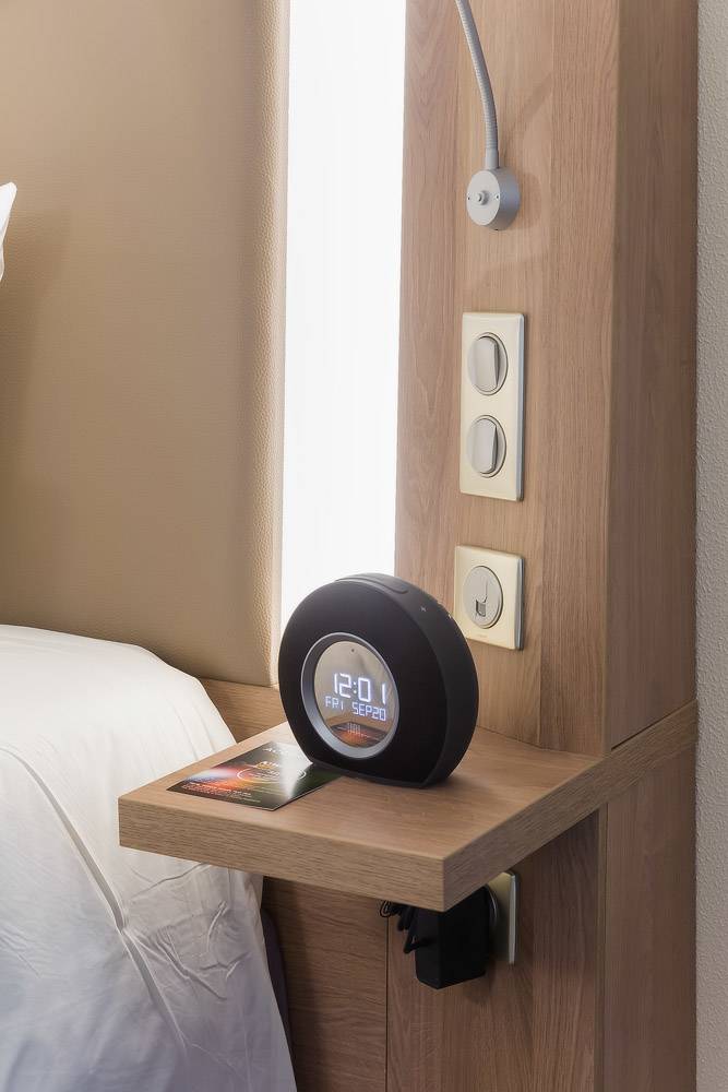 с розетками и подстветкой, встроенными в изголовье кровати.