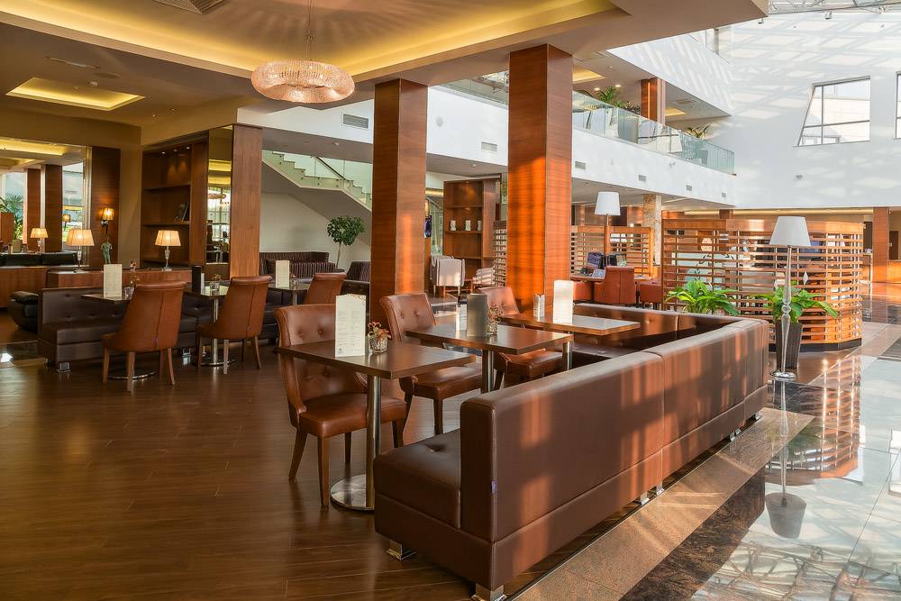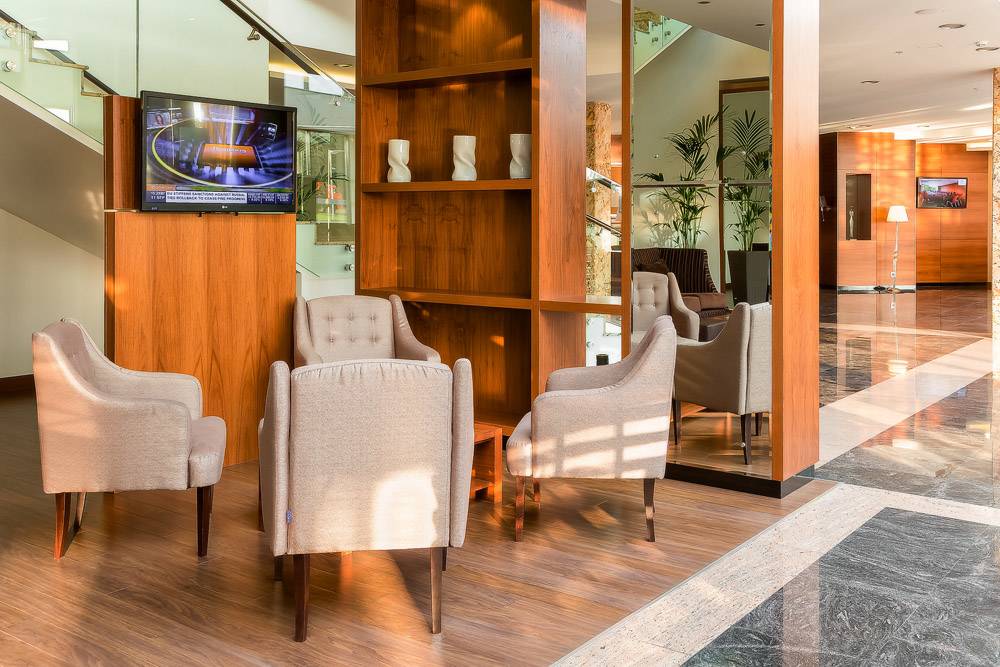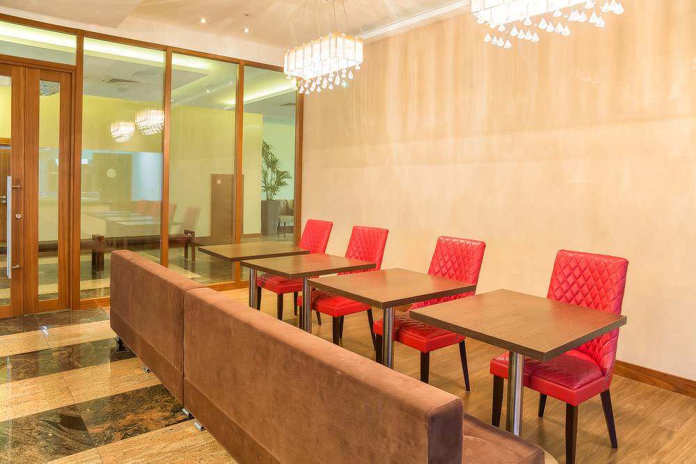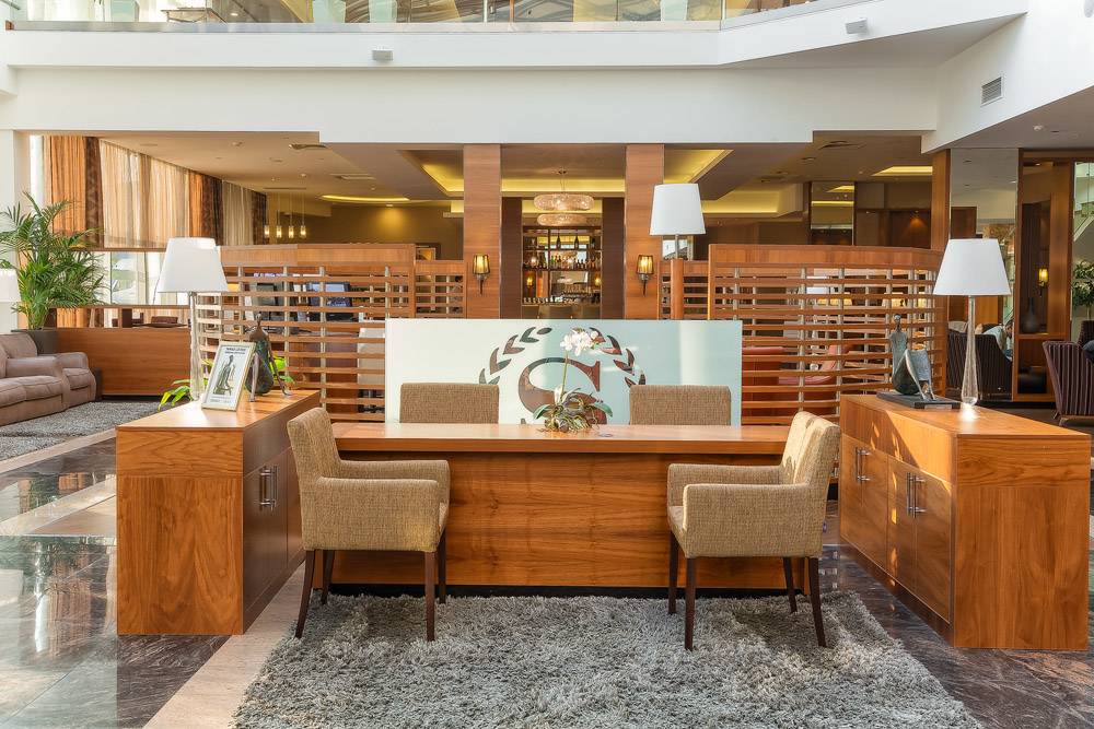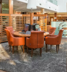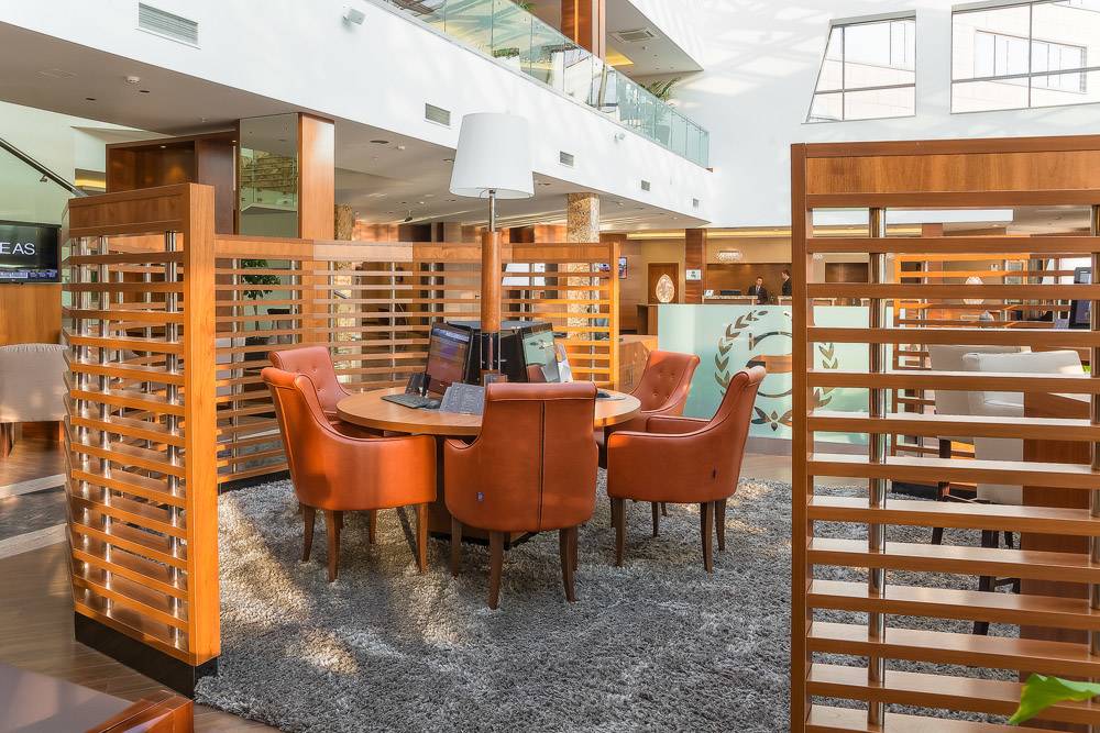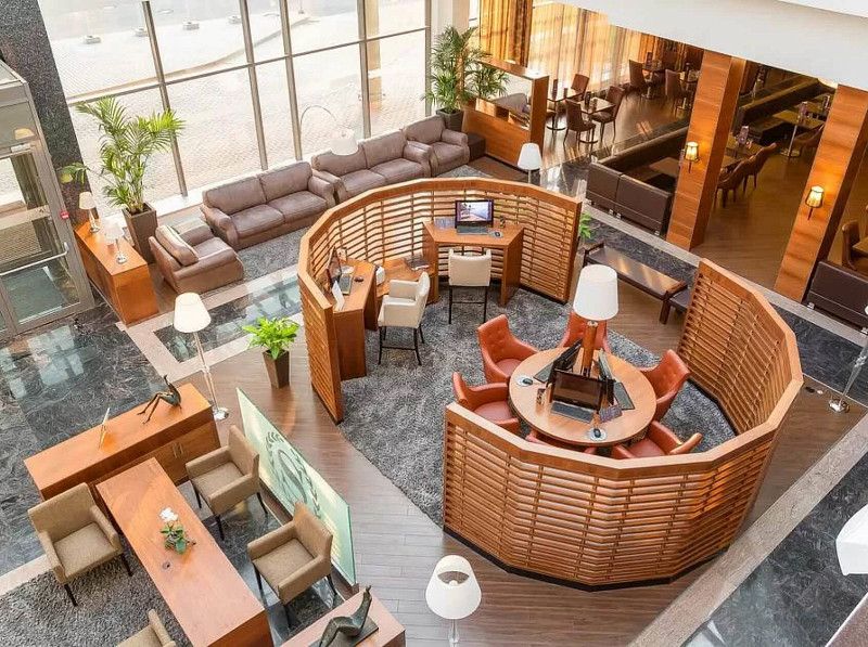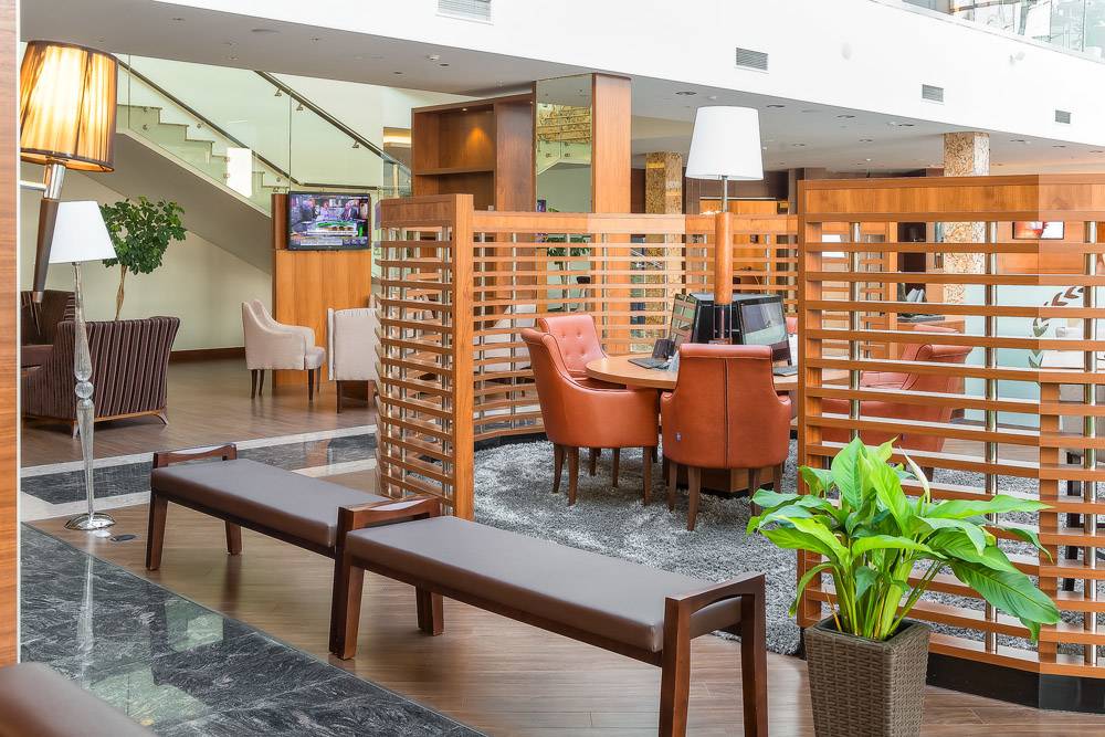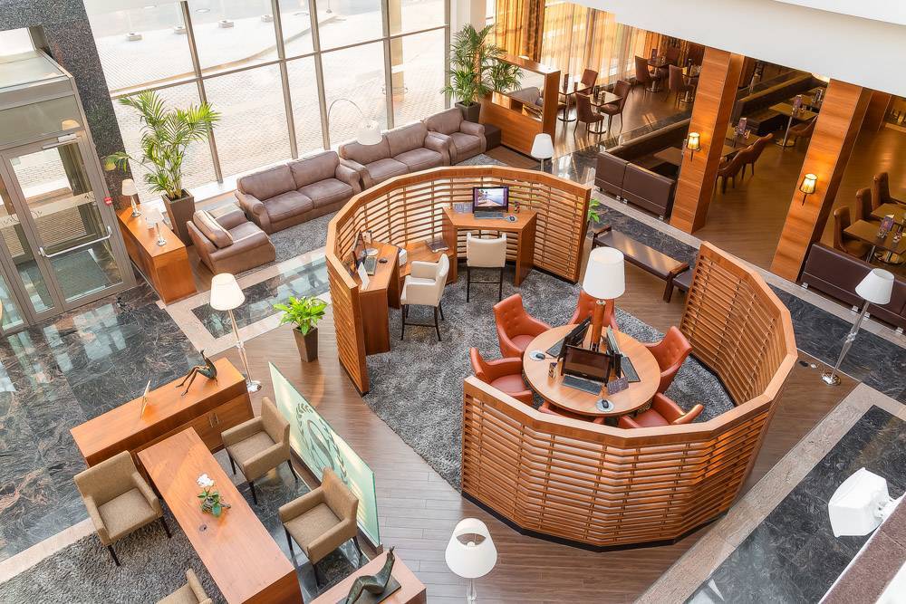 Полное оборудование зоны лобби мягкой мебелью, столами для переговоров.